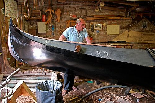 Tornando alla gondola in mostra, si tratta di un modello realizzato da uno più illustri squeraroli (costruttori e riparatori di gondole), Nedis Tramontin (Venezia, 1921-2005), in scala 1:2.