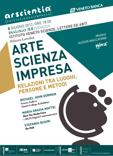 Le connessioni tra arte, scienza e impresa diventano così visibili e possono concorrere a vincere il Premio Arscientia, che si distingue nelle due categorie under e over 18 e si rivolge a persone di ogni età, con idee ad alto contenuto innovativo. Arscientia accompagnerà i creativi per un anno intero, da maggio 2012 a giugno 2013, avvalendosi della partnership con l’Università Ca’ Foscari di Venezia, l’Istituto Veneto di Scienze, Lettere ed Arti, lo IED Istituto Europeo di Design di Venezia e Moleskine.