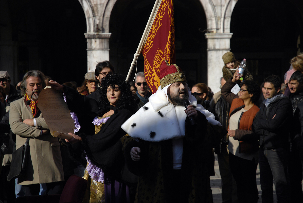 Introdotto da una goliardica, ma sagace e pungente (in perfetto stile Venessia.com), rappresentazione in cui un antico Doge (interpretato magistralmente da Cesare Colonnese) della Serenissima Repubblica di Venezia, si risveglia ai nostri giorni per scoprire una città ben lontana dai fasti passati, elencando una serie di problematiche attuali e scottanti, l’evento è continuato con l’intervento dei rappresentati di alcune tra le più attive associazioni veneziane: