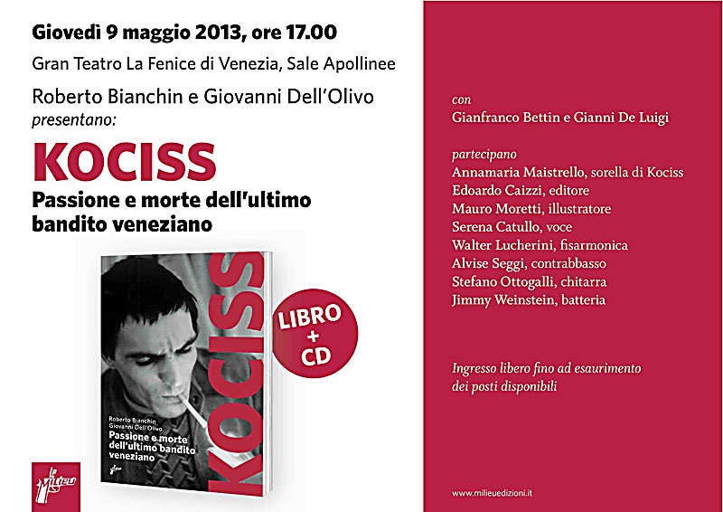 Il libro e il cd verranno presentati nelle Sale Apollinee del Gran Teatro La Fenice di Venezia giovedì 9 maggio 2013 alle ore 17. Insieme agli autori ci saranno lo scrittore e assessore comunale Gianfranco Bettin che ha curato la prefazione del volume, il regista Gianni De Luigi che ha firmato l’omonimo spettacolo teatrale, l’editore Edoardo Caizzi di Milieu, la sorella di Kociss, Annamaria Maistrello, dal cui diario sono tratte alcune pagine del libro, e Mauro Moretti, illustratore.